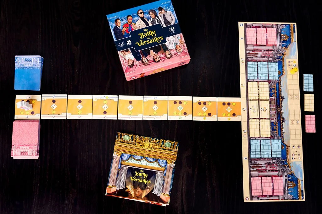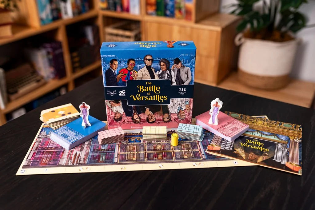In the game The Battle of Versailles, players take the role of either the France or U.S. team, facing one another by playing action cards to show off their best dresses, to attract the most popular celebrities, or to annoy the opponent by spreading bad gossip. They also compete to contribute more than their opponent to the reconstruction of the palace of Versailles.
