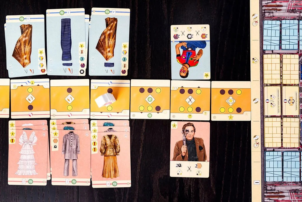 The French player has five actions per round, representing the classic but overly-long show (2h 30min) that it put on, while the American player has only three actions per round as their show was fresh, innovative, and short (only 37min). Correspondingly, the game has different victory conditions: