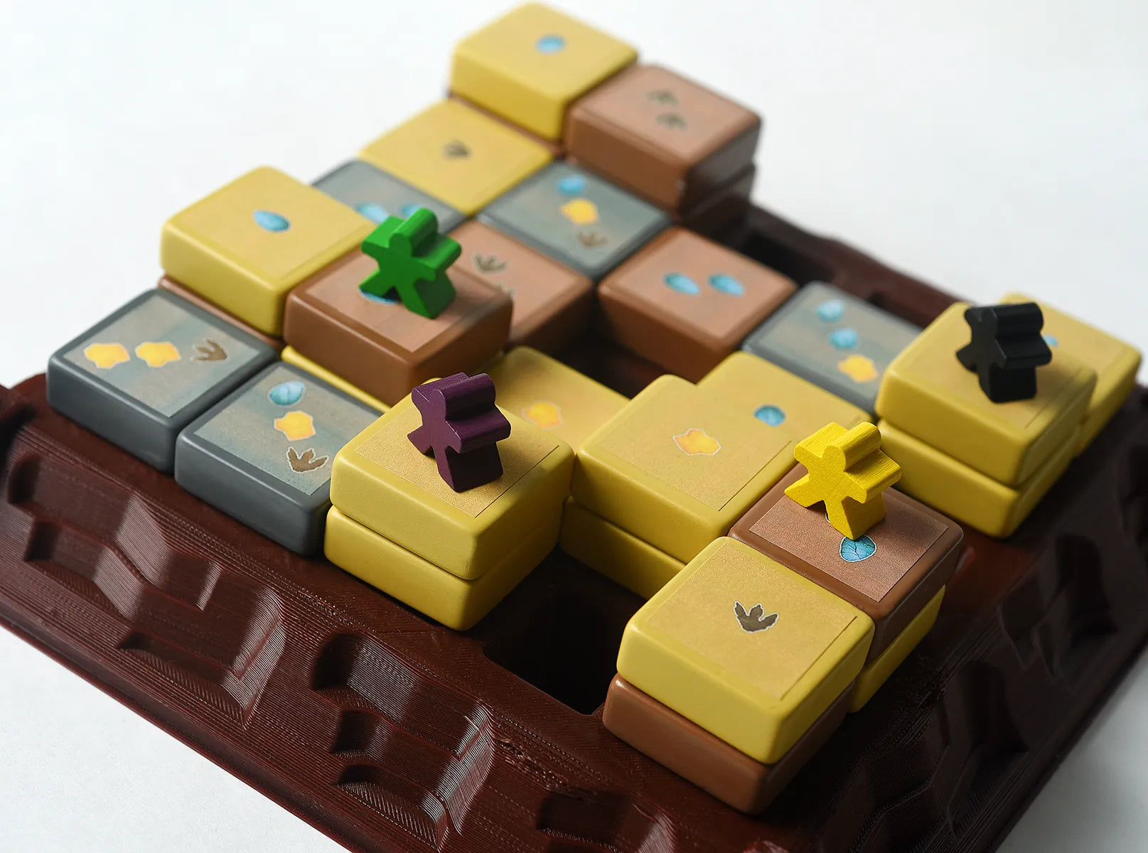 Fossilis features a unique 3D dig site board, with recessed pockets filled with dinosaur bones, and thick, chunky terrain tiles that cover the dig site. Players have to use strategy, timing, and a little bit of luck if they want to make the best discoveries, get their name in all the paleontology journals, and of course, win the game.