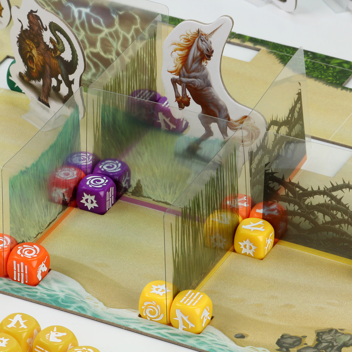 As one of the competing mages, you will use your share of 80 custom dice as seeds to hold semi-transparent cards that represent fences of bamboo, lightning, thorns, and water. Use these fences to capture magical beasts: chimeras, unicorns, basilisks, and centaurs. The winner of the tournament is the magician who has the most points for capturing beasts and building fences. That Wizard will become the Champion of Magic!