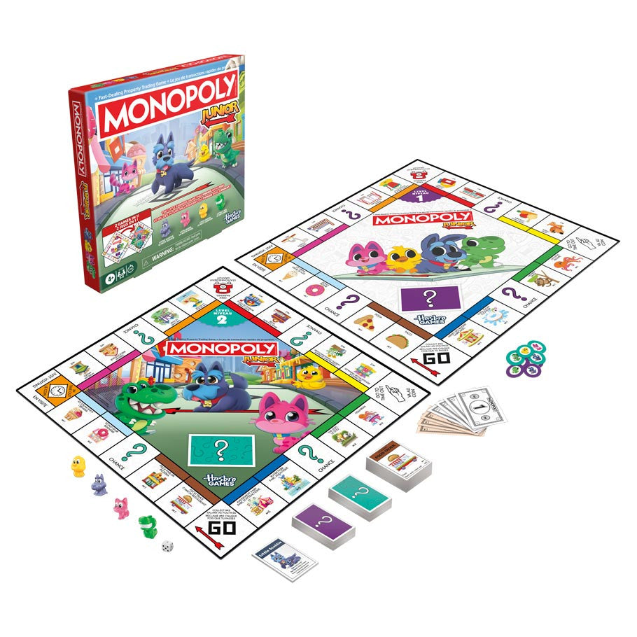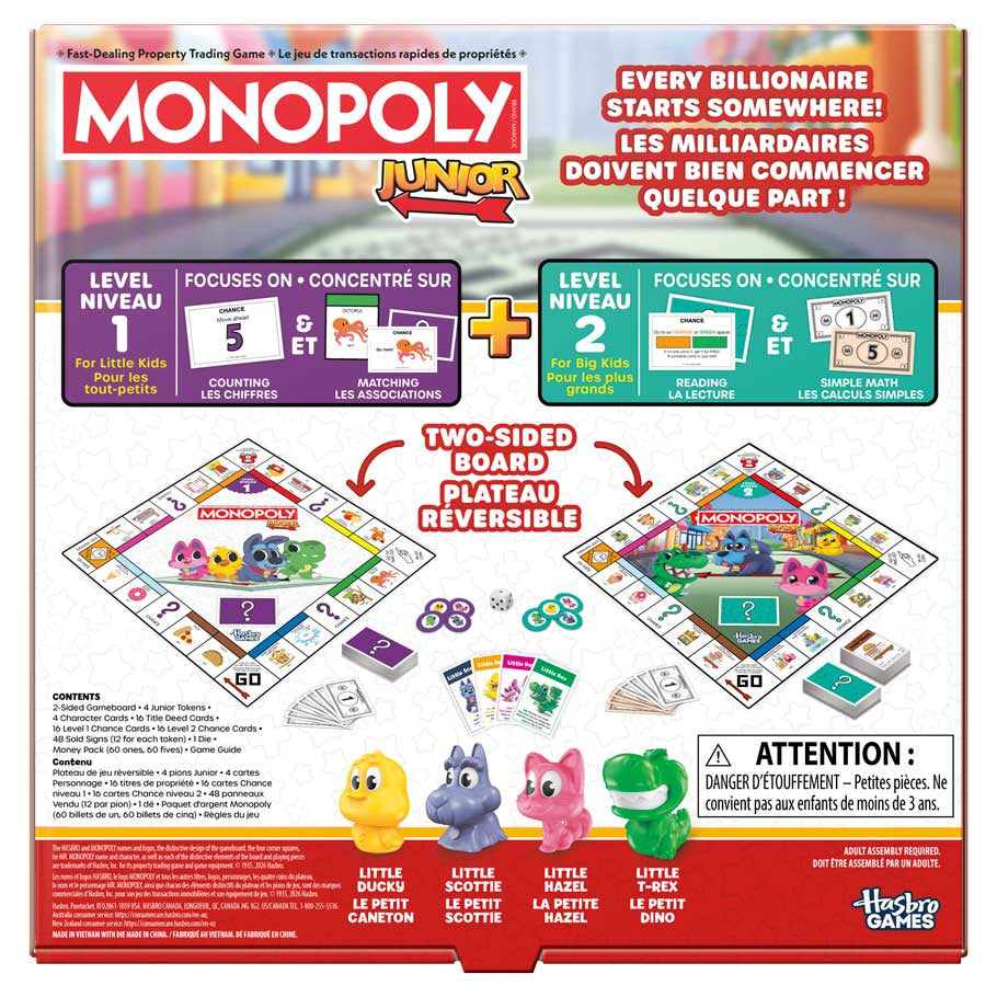 Every billionaire starts somewhere! This 2-in-1 Monopoly Junior game for kids features a double-sided board and 2 levels of difficulty, so families can decide which level is best for them. The Level 1 game, recommended for ages 4-5, helps kids practice matching and counting, as they count spaces, match pictures, and buy properties. The player with the most properties wins! Flip over the board for the more advanced Level 2 game for ages 6+. It focuses on reading and simple math. Players can land on kid-friendly spaces, buy properties, collect rent, and discover their fortune! To win, be the player with the most money. For 2 to 4 players, the Monopoly Junior game is a great indoor game for family time, after dinner, and vacations. Board games for kids and preschool games also make fun gifts for kids, too.