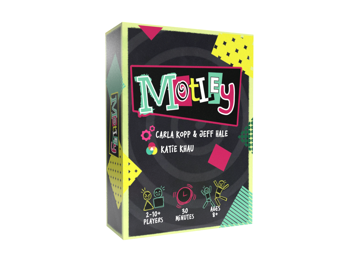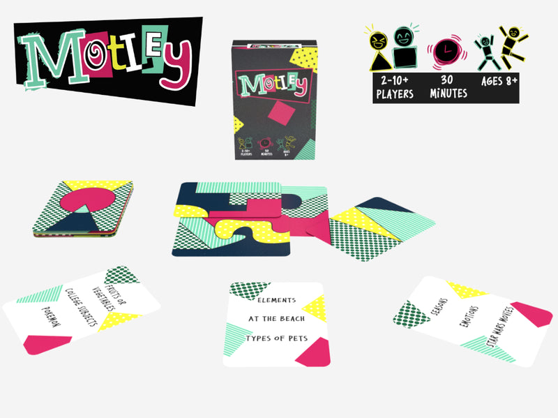 Motley is a small box, 27 card party game, where each card has a unique abstract layout of 5 patterns on one side with 3 listed categories on the other side. Gameplay can be competitive or cooperative, but is always fast and fun!