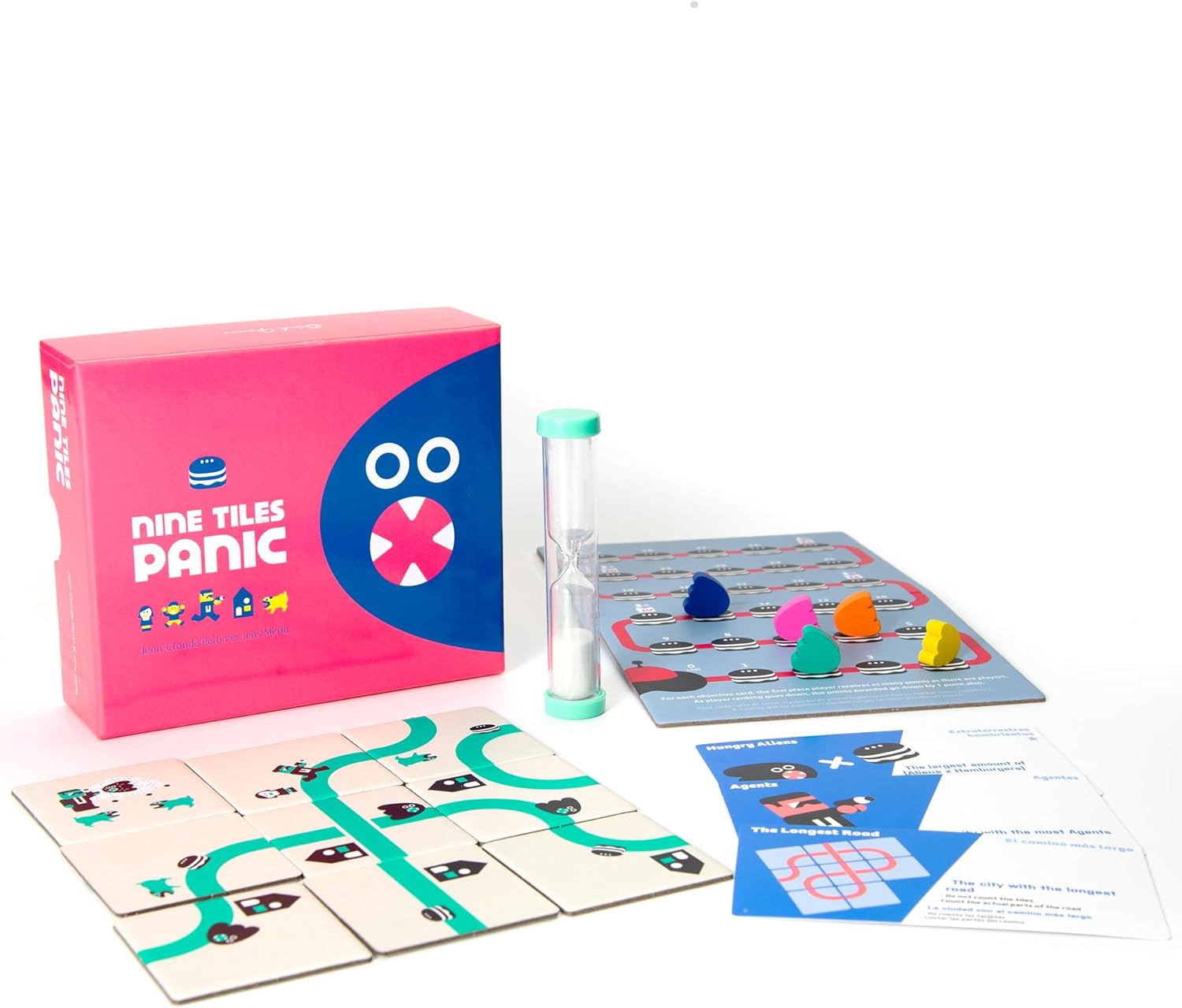 "Nine Tiles Panic" is the follow-on game of the game "Nine Tiles", an Oink Game that is only available in Japan. Both games are created by the same authors. "Nine Tiles" also is a speedy puzzle game, but the new "Nine Tiles Panic" adds decision making and tactics to the game, so that you can experience a totally new kind of fun game play.