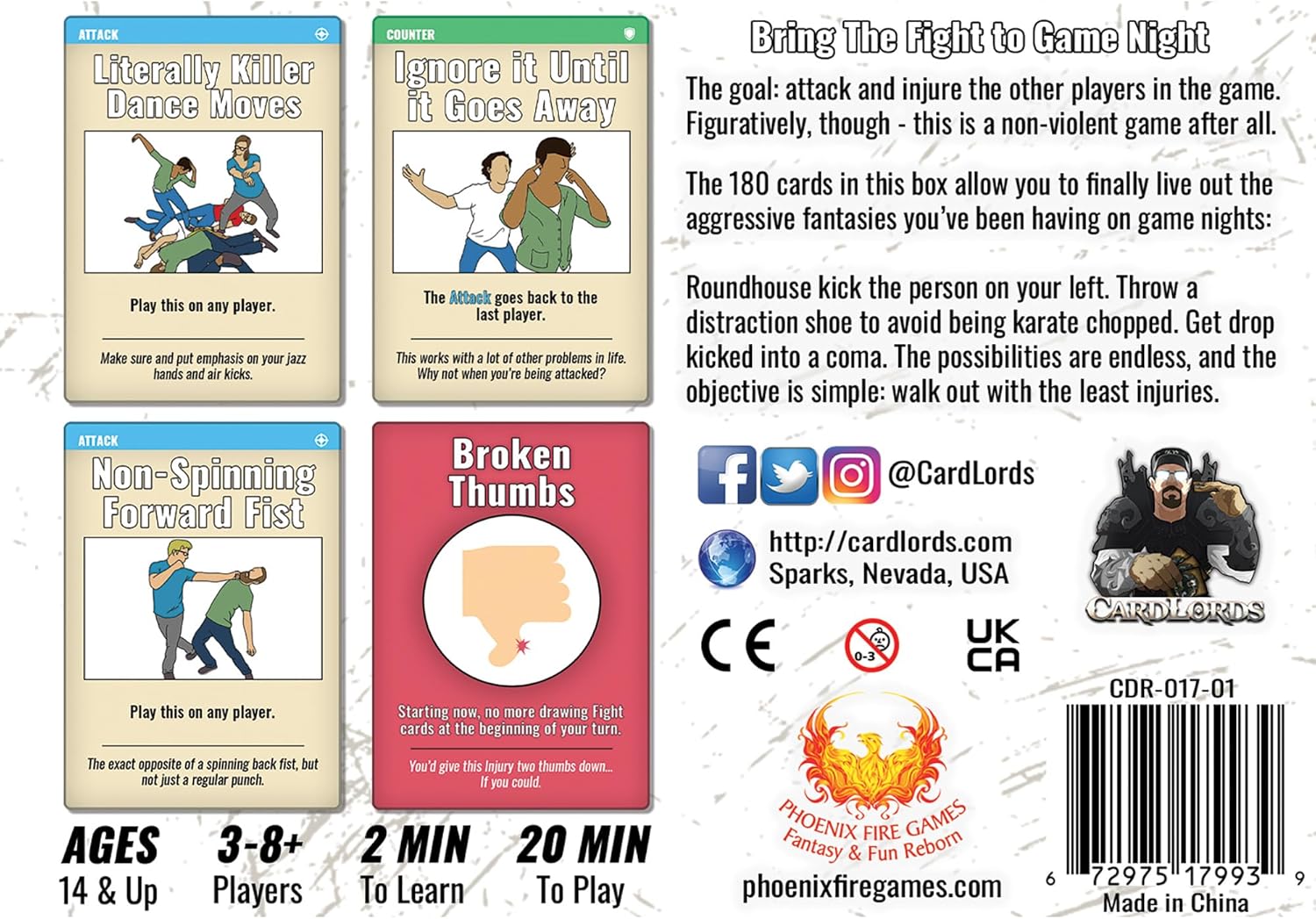 The 180 cards in this box allow you to finally live out the aggressive fantasies you’ve been having on game nights. Roundhouse kick the person on your left. Throw a distraction shoe to avoid being karate chopped. Get drop kicked into a coma. The possibilities are endless, and the objective is simple: walk out with the least injuries.