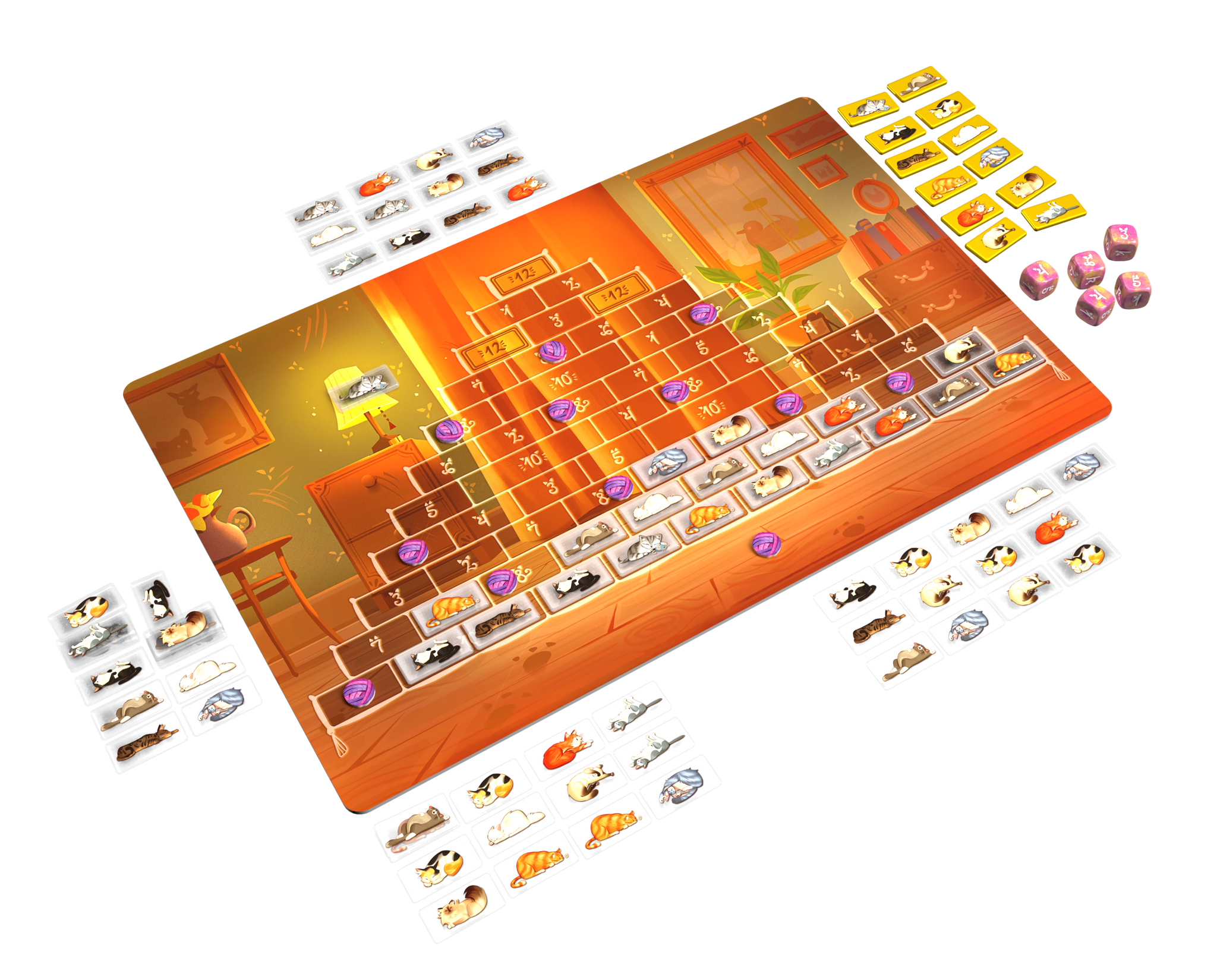A wacky family game with a push-your-luck mechanic. Players take on the roles of grandchildren helping Grandma put all her kittens to bed - and she has a lot of them! The cats love to sleep in one place, next to each other (and on top of each other), so it takes a bit of creativity. The first player to tuck all their assigned kittens in wins!