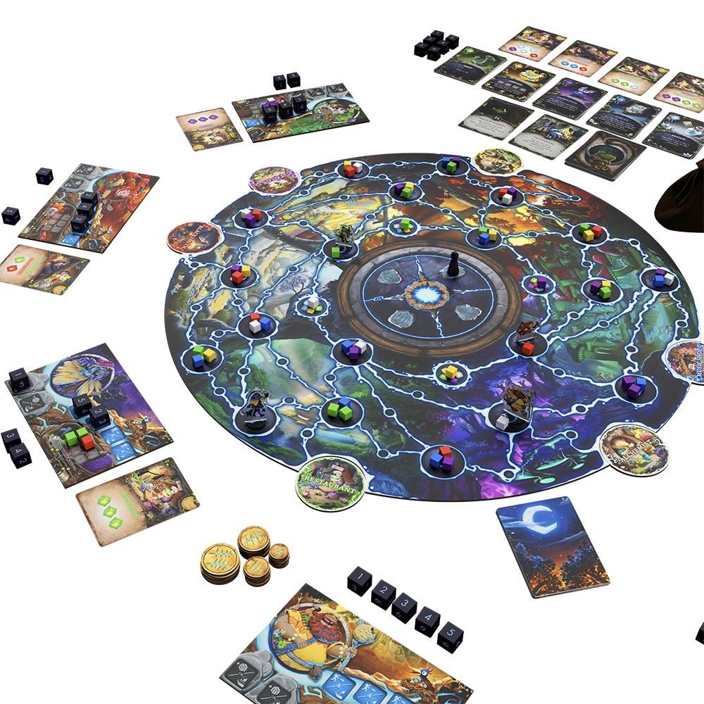 Explore the forest and forage for resources, then travel the leylines to deliver goods to the stores that want them! Use strategic dice placement to plan your route for the round, and purchase items to customize your abilities. Will you cash in for a quick boost, or collect resources to fulfill a big order?