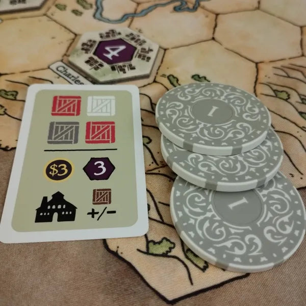 On your turn, you can perform two actions from a selection of choices, letting you lay tracks, build factories, fulfill contracts, earn money, or collect more contracts. Building a factory brings resources to the board that all players have access to...at a price.