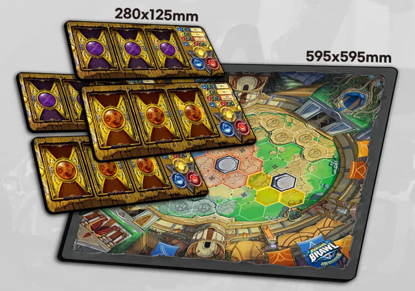 A stitched neoprene mat will replace the board from the arena, and four player mats will enable to play a 2 v 2 match without any cardboard under your miniatures, tokens and cards.