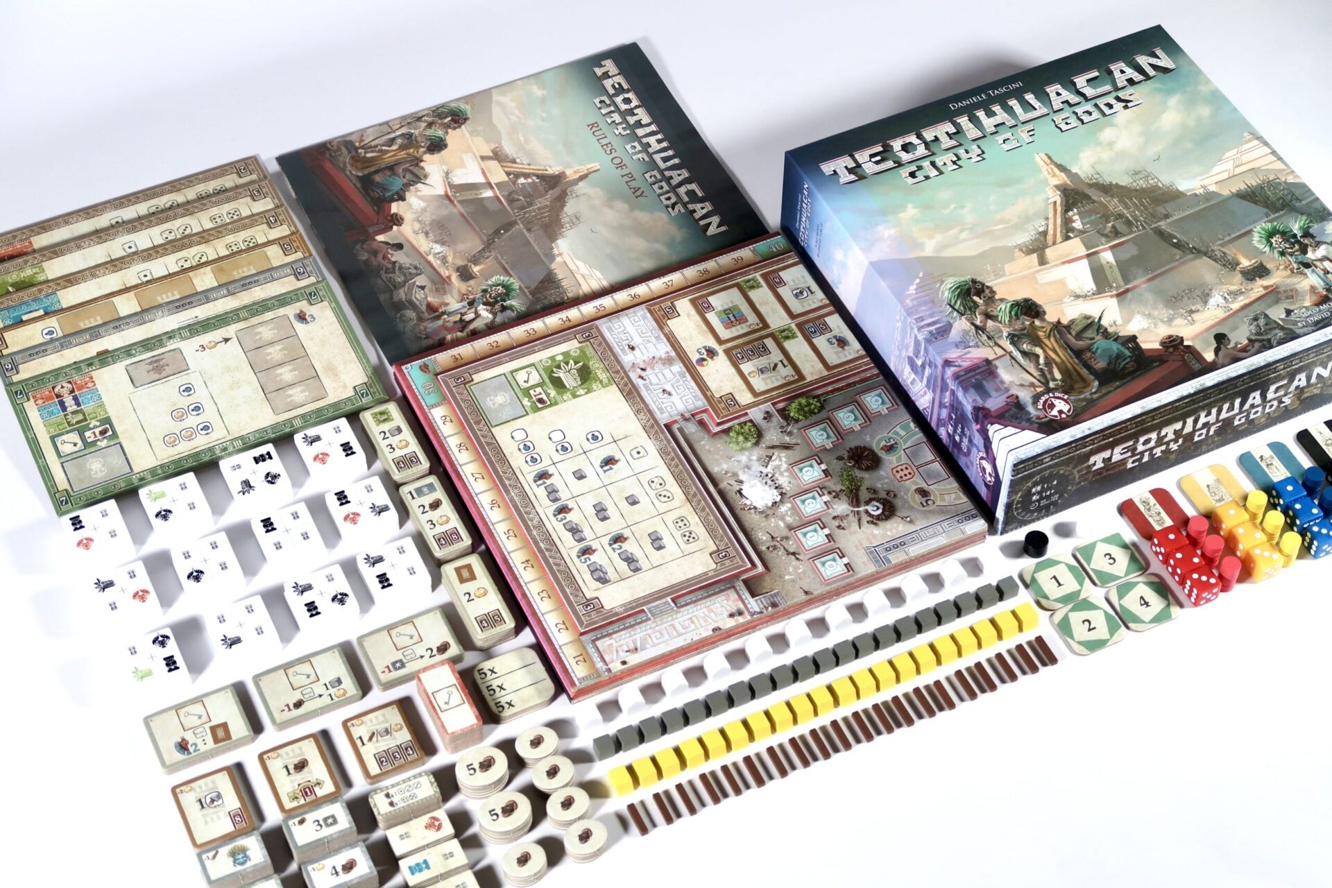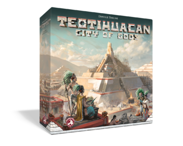 In Teotihuacan: City of Gods, each player commands a force of worker dice, which grow in strength with every move. On your turn, you move a worker around a modular board, always choosing one of two areas of the location tile you land on: one offering you an action (and a worker upgrade), the other providing you with a powerful bonus (but without an upgrade).