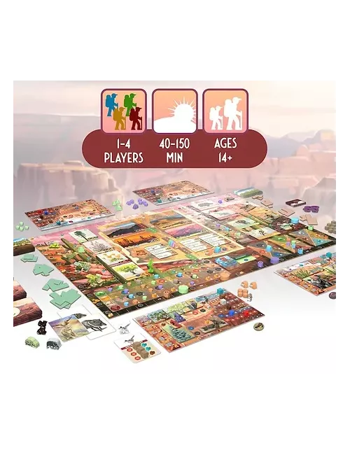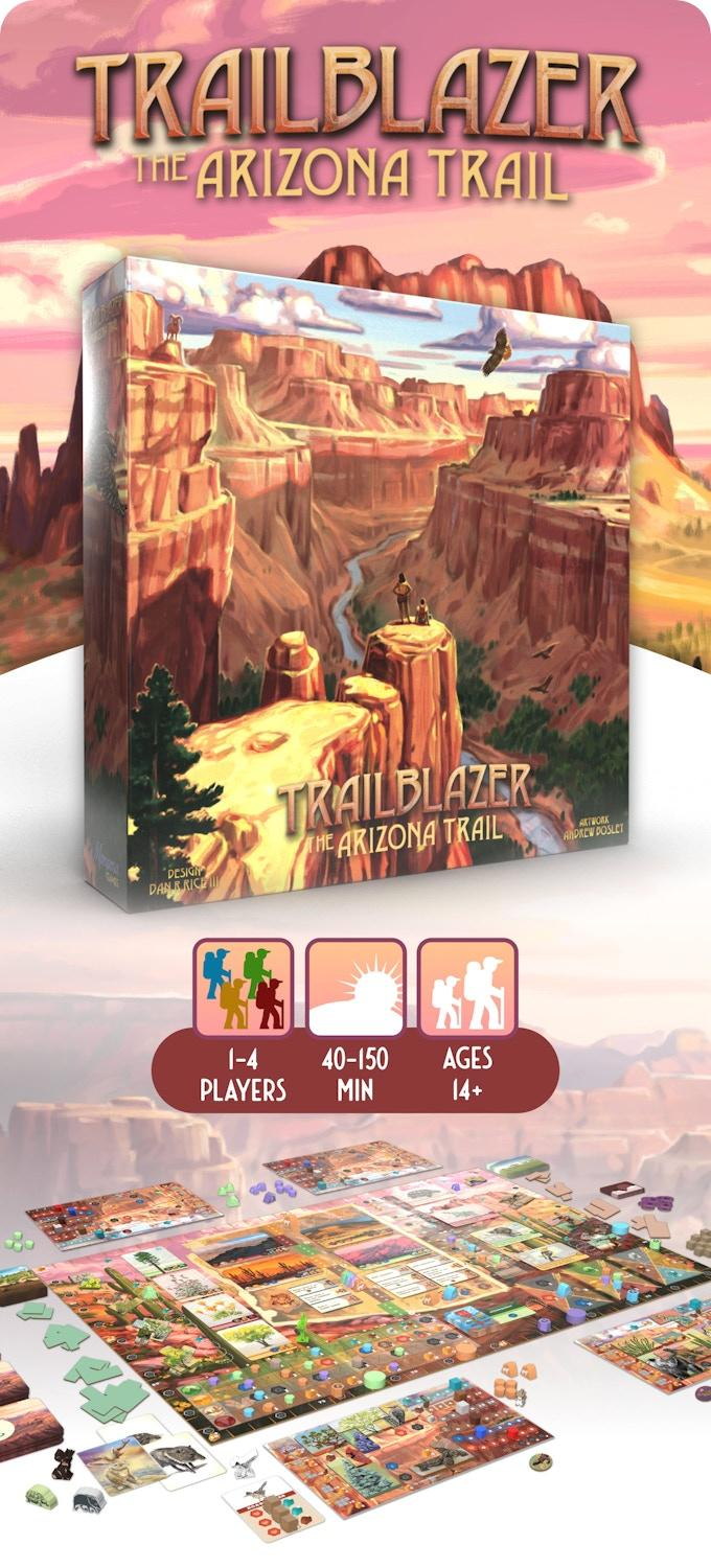Players will call upon the legendary Jackalope and Lost Dutchman to aid in their travel. Turn order is determined for each round of travel and actions through a unique movement and observation mechanism. Players will need to acquire an interesting blend of key Natural and Personal resources to obtain advantages and create their own mural of Arizona wonders through efficient placement of polyomino depictions.