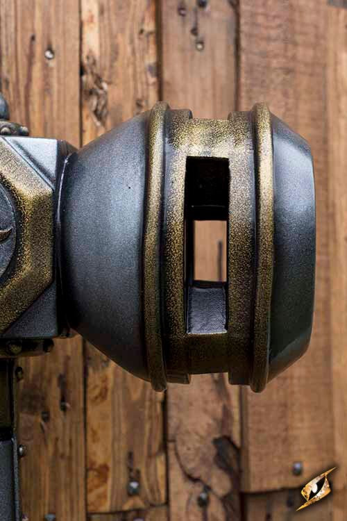 Epic Armoury’s Sun Hammer is a 135cm latex hammer uniquely designed to be safer and easier to wield in combat. The Sun Hammer’s 39cm long head is asymmetrical, featuring a flat 20cm wide face on one end and a spike on the other. The head is hollow, making it safer to use and more lightweight than a foam alternative. Sculpted and hand painted to look like dwarven forged metal, the head is attached to a similarly decorated haft and a 49cm black leather wrapped grip.