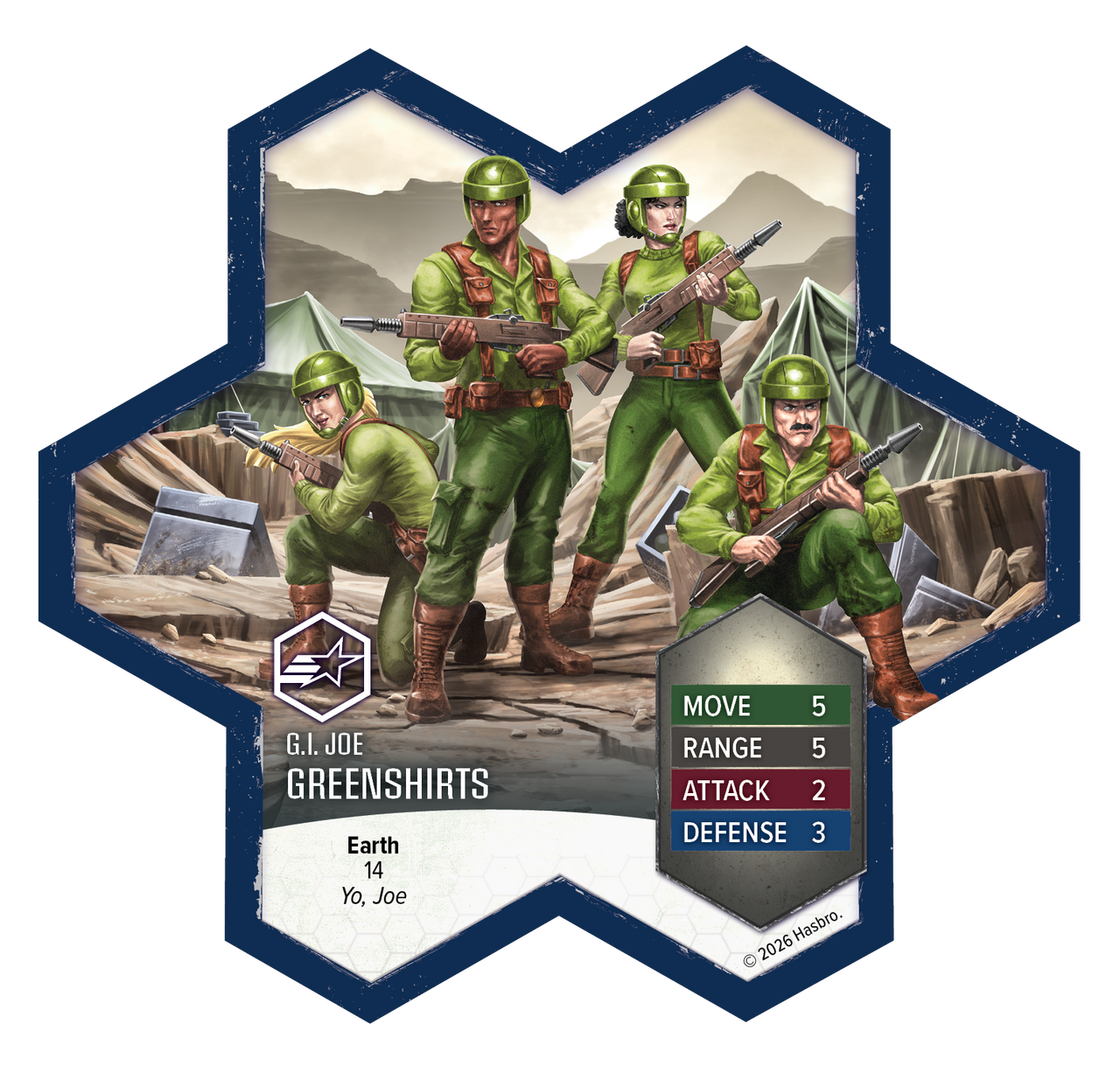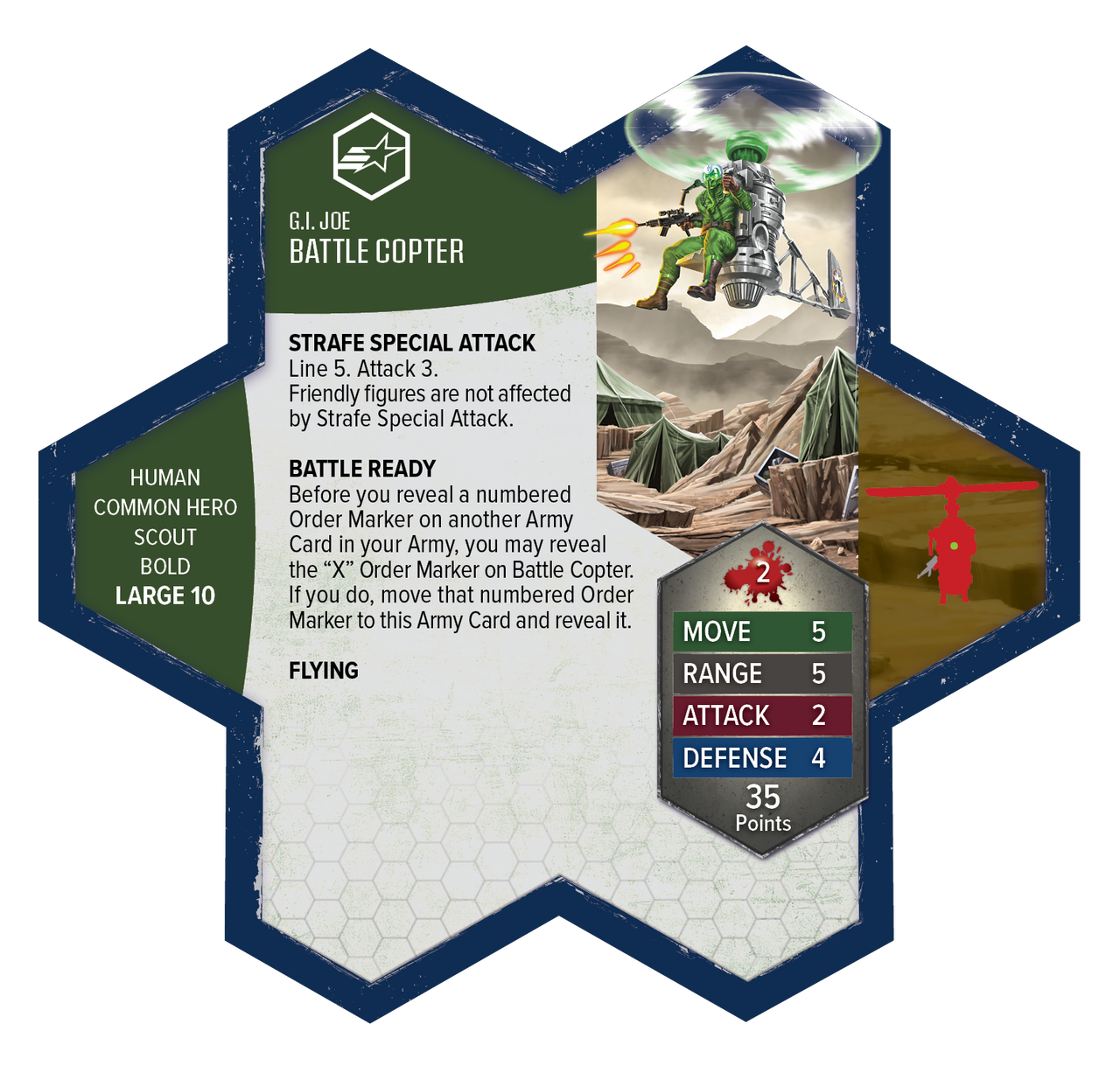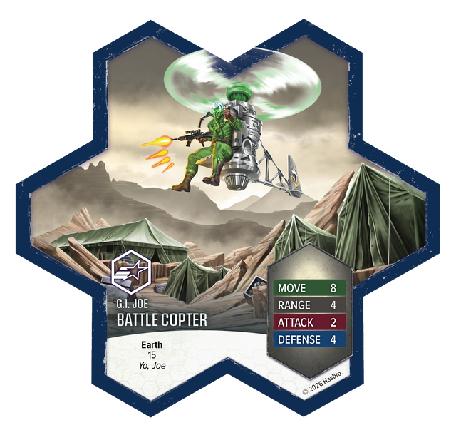 This expansion includes one Common Hero, one 4-figure Common Squad, and two Army Cards. The Greenshirts coordinate with nearby G.I. JOE and Soldier Heroes, moving them into position before unleashing their own attacks. Above the battlefield, the Battle Copter swoops in with a devastating Strafe Special Attack that spares friendly forces, ready to take command at a moment’s notice. Together, these common troops and airborne support units deliver new tactical flexibility to your Heroscape armies.