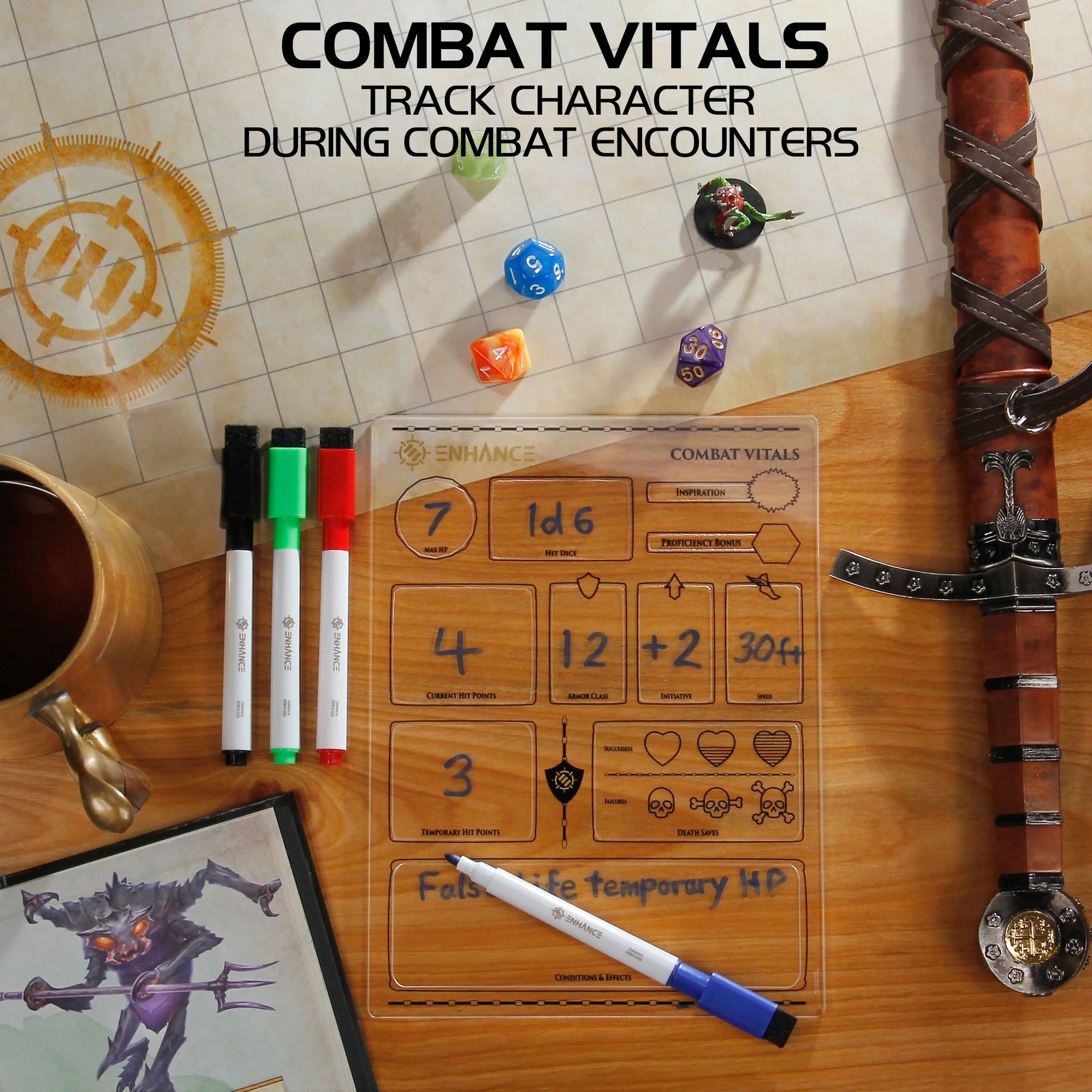 - REUSABLE CHARACTER SHEETS – The set includes three 8" x 6" sheets: "Combat Vitals" (combat encounters), "Equipment" (inventory), "Spells & Abilities" (spell slots, magical/class resources)