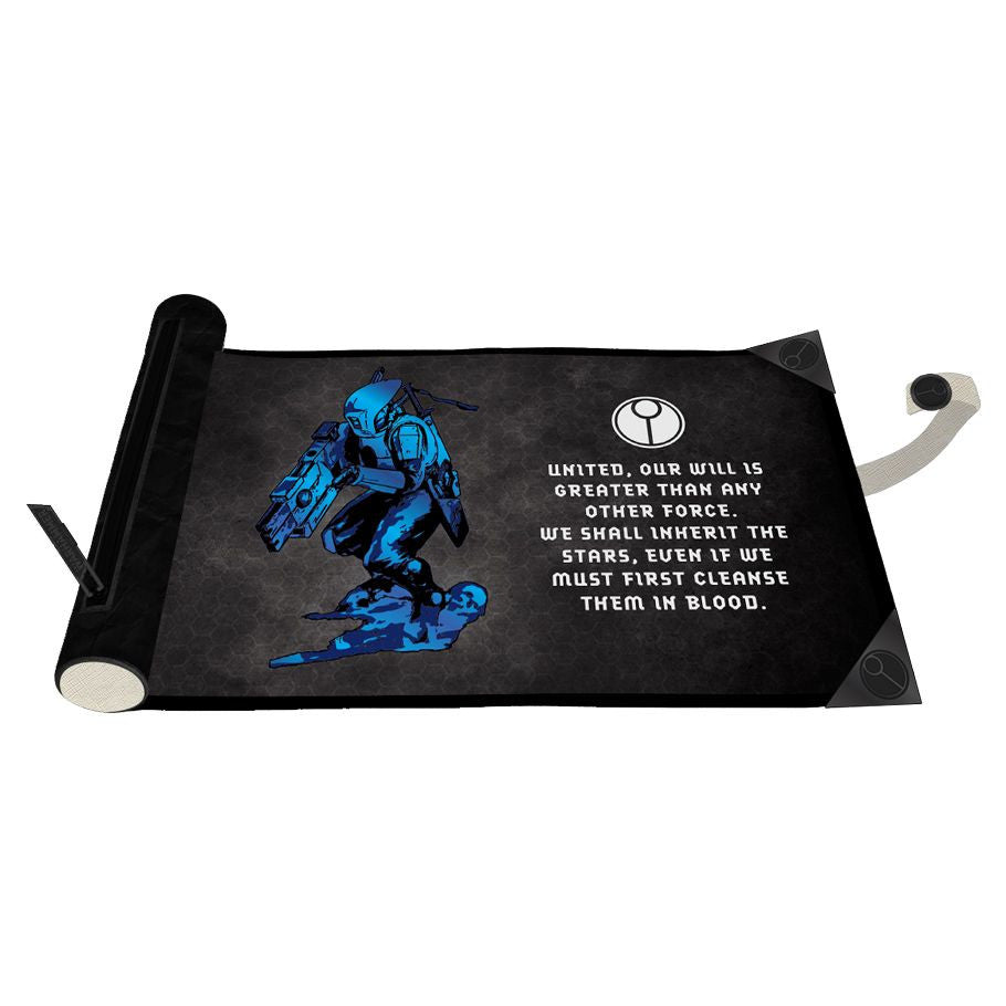 “In the grim darkness of the far future there is only war”, so prepare for battle with tabletop accessories for Warhammer 40,000! This T’au Empire Dice Scroll offers premium dice storage and a convenient built-in rolling mat, so you can store and roll all the dice you need to command your armies in style. Made with a textured leatherette exterior and soft microfiber interior, you can safely store around 20+ of your favorite RPG dice inside the zippered compartment, decorated with metal faction emblems. Unfurl the rolling mat to find a protective surface that’s perfect for tossing dice while keeping your tabletop safe from scuffs, featuring the T'au Empire symbol, a foil T'au Empire Pathfinder Team Unit, and a T’au quote. When finished, simply roll it back up around the zippered compartment and secure it shut with the strap and snap button closure to create the look of a scroll from the Dark Age of Technology.