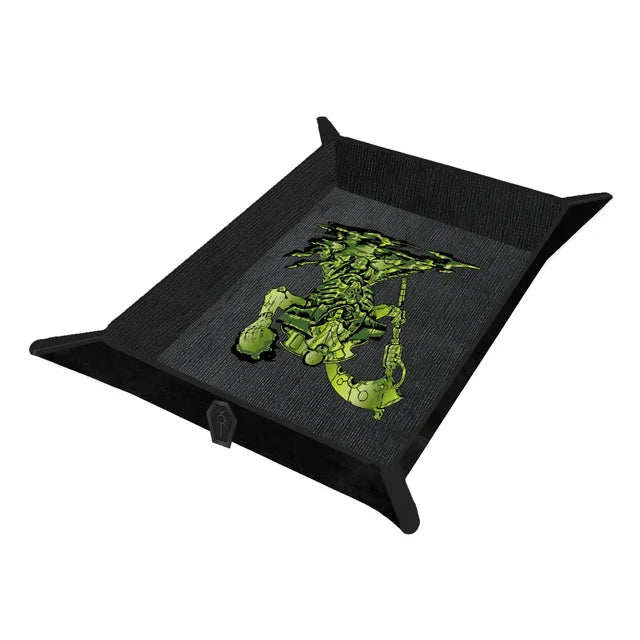 “In the grim darkness of the far future there is only war”, so prepare for battle with tabletop accessories for Warhammer 40,000! This Necrons Folding Dice Tray offers a safe space for rolling your RPG dice when commanding your armies. Using the small magnets inside each corner, you can easily create an instant dice rolling area in seconds: simply pop up the side walls and you’re ready to roll! No bulky clasps or snaps needed. The reversible design features a textured leatherette with Necrons symbol on one side, and a foil Necrons Warrior and faction emblem on the other. Sized no bigger than a sheet of paper (8.5 in. x 11 in.) when folded flat, you can easily take your dice rolling tray with you on the go inside your Datasheet Folio or Codex Book Folio.