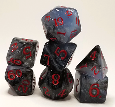 Presenting a gorgeous black and transparent silver dice with micro glitter and menacing red inked font.