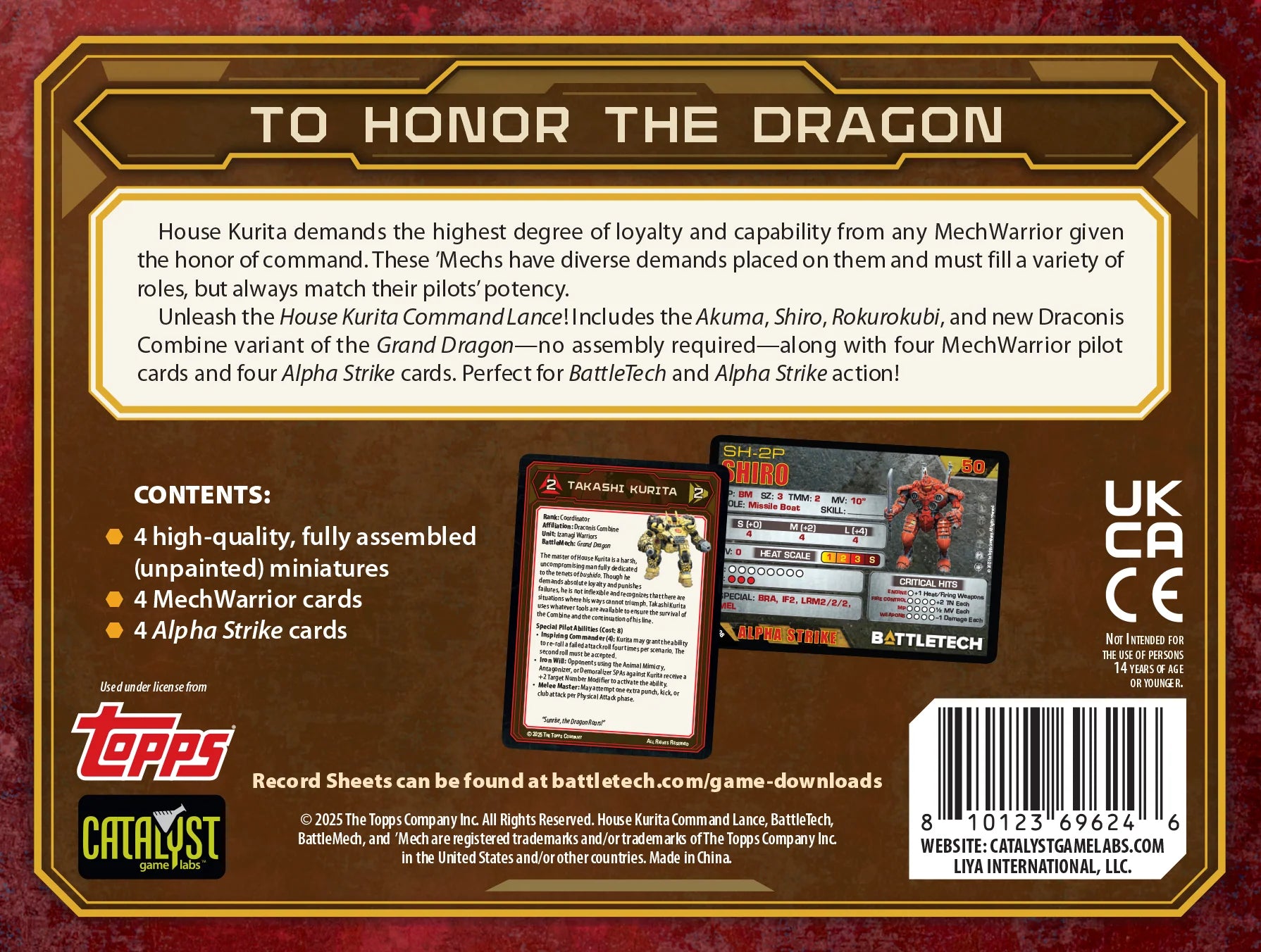 Unleash the House Kurita Command Lance! This Force Pack includes the Akuma, Shiro, Rokurokubi, and the new Draconis Combine variant of the Grand Dragon, along with four MechWarrior pilot cards and four Alpha Strike Cards.