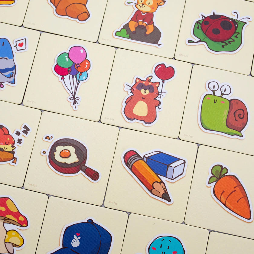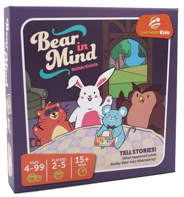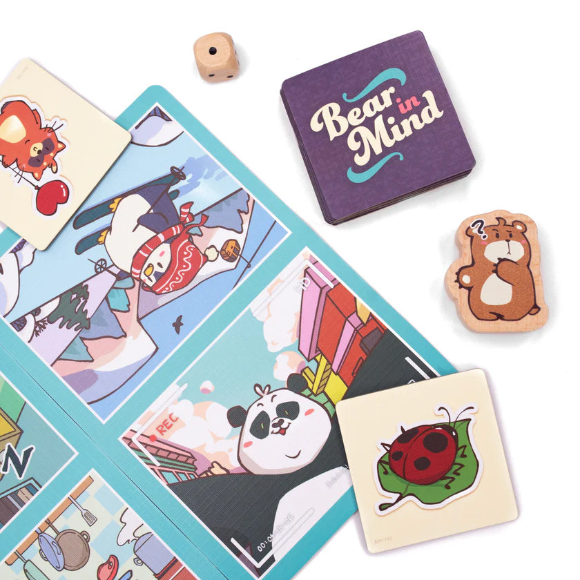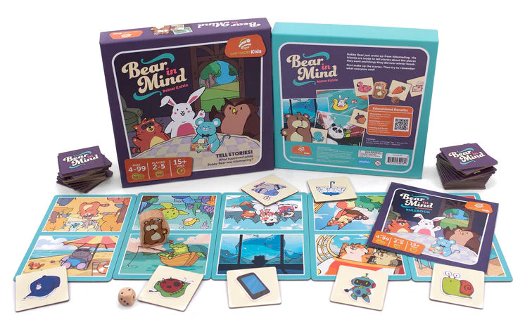 Bear in Mind is a game for 2-5 players and plays in roughly 15 minutes. It’s appropriate for players as young as 4 and as old as 99! In a game of Bear in Mind, players will draw tiles and tell stories the connect the image with the story boards on the table. On later turns, players will have to remember the facedown tile and its shared story. When Bobby Bear lands on a picture without a tile, the game is over and the player with the most tiles is the winner!