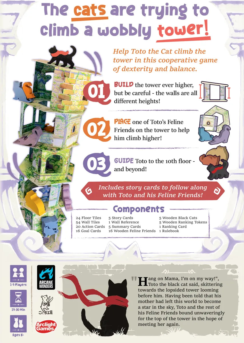 In Cat and the Tower, you will work together with other players to help Toto the cat on his way up a perilous tower to reach the stars, where he believes his mother is waiting for him. It is up to you and the other players to build the tower yourself, which will require a constant balancing act of mismatched walls and moving Feline Friends. Depending on the luck of the draw, you may be stuck with options forcing you to build with walls of extremely varying height that can send the entire tower toppling over if you are not careful.