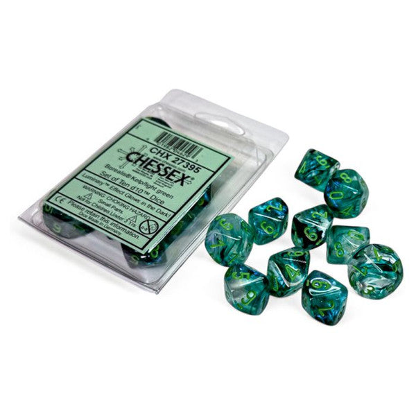 Contains 10 Borealis Kelp d10 dice with light green numbers (PB1095) in Plastic Clamshell This color has our Luminary™ effect. It can look like stars in the dark (with enough light exposure beforehand or under a black light).