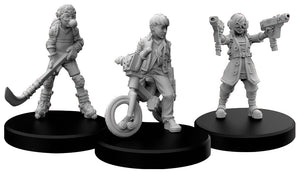 It's one thing to live through the time of the RED - it's another to be born into it... In parts of the city where the adults have fled, the youth run the streets. This set contains three Gen Red kids: one armed with a pair of machine pistols, a bike rider with a handgun, and a kid on skates brandishing a weaponized hockey stick.