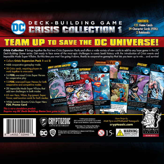 Team up to save the DC Universe! Crisis Collection 1 brings together the first two Crisis Expansion Packs for the DC Deck-Building Game series and offers a wide variety of new cards to add to any base game. Get ready to face some of the most epic challenges in comic book history with the introduction of Crisis events and Impossible Mode Super-Villains. But this time you won’t be going it alone, thanks to cooperative gameplay that lets you team up to win… and survive!