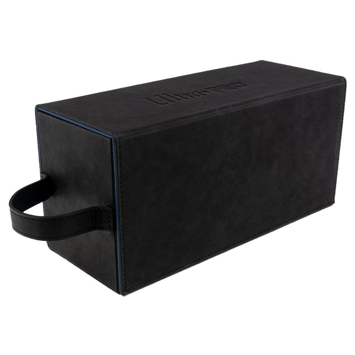 The textured leatherette exterior features a strong magnetic closure, built-in breaker area, and wrist strap for easy transport. The cover transforms into a built-in breaker mat. A smooth leatherette interior holds three Toploader boxes, 150+ Standard 3" x 4" Toploaders, OR thirty 35pt ONE-TOUCH magnetic holders. The perfect all-in-one set up for breaking packs!