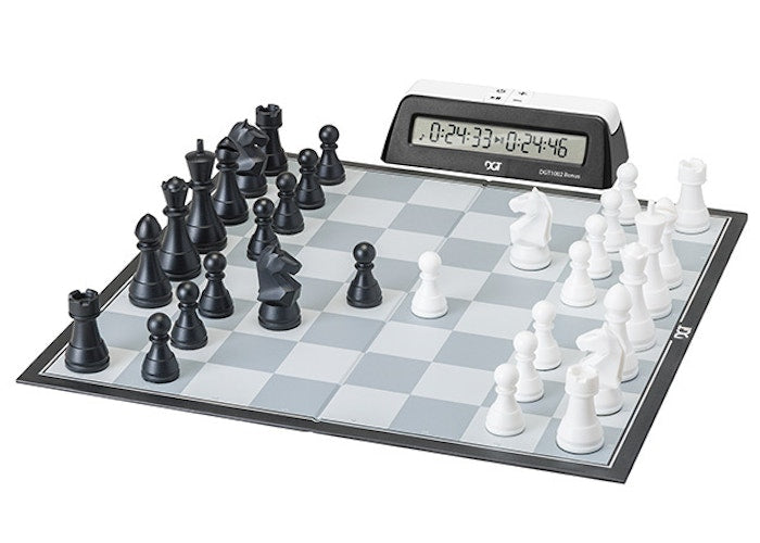 Elevate your creative thinking with this thoughtfully crafted chess set. It invites two players to connect, strategize, and enjoy a stimulating game of chess. The addition of the DGT1002 Bonus Chess Timer is a feature that sets this chess box apart. The pieces have a DGT-registered Modern Staunton design and are small in size, ideal for children.