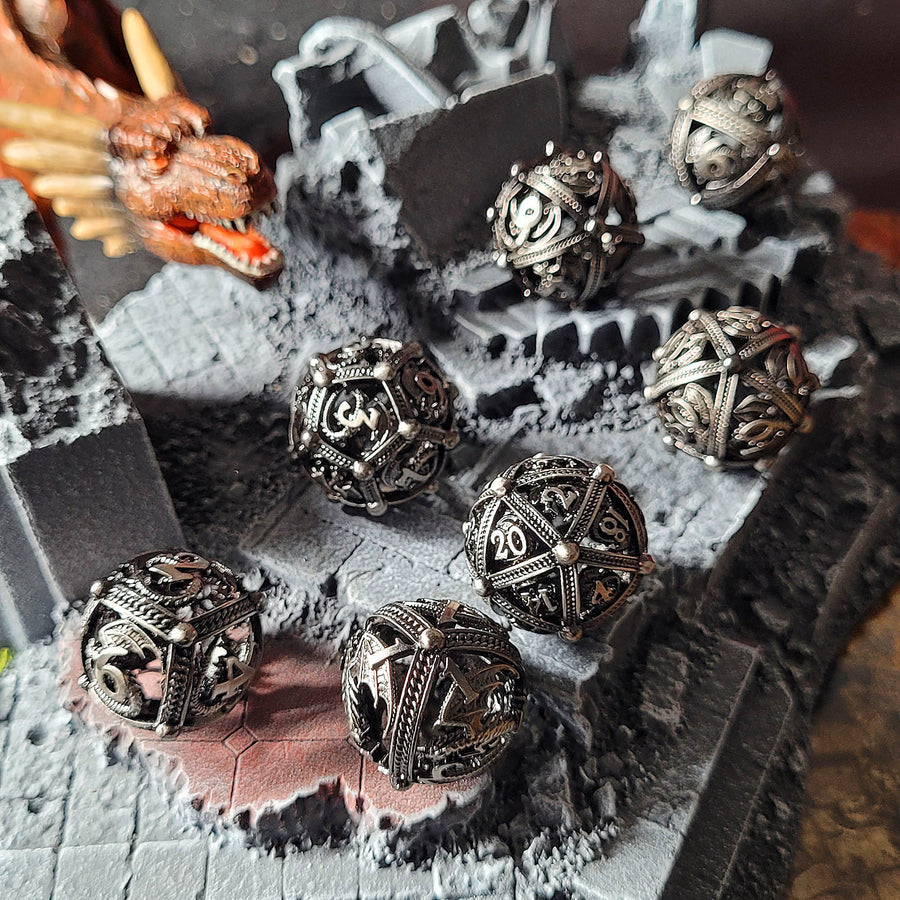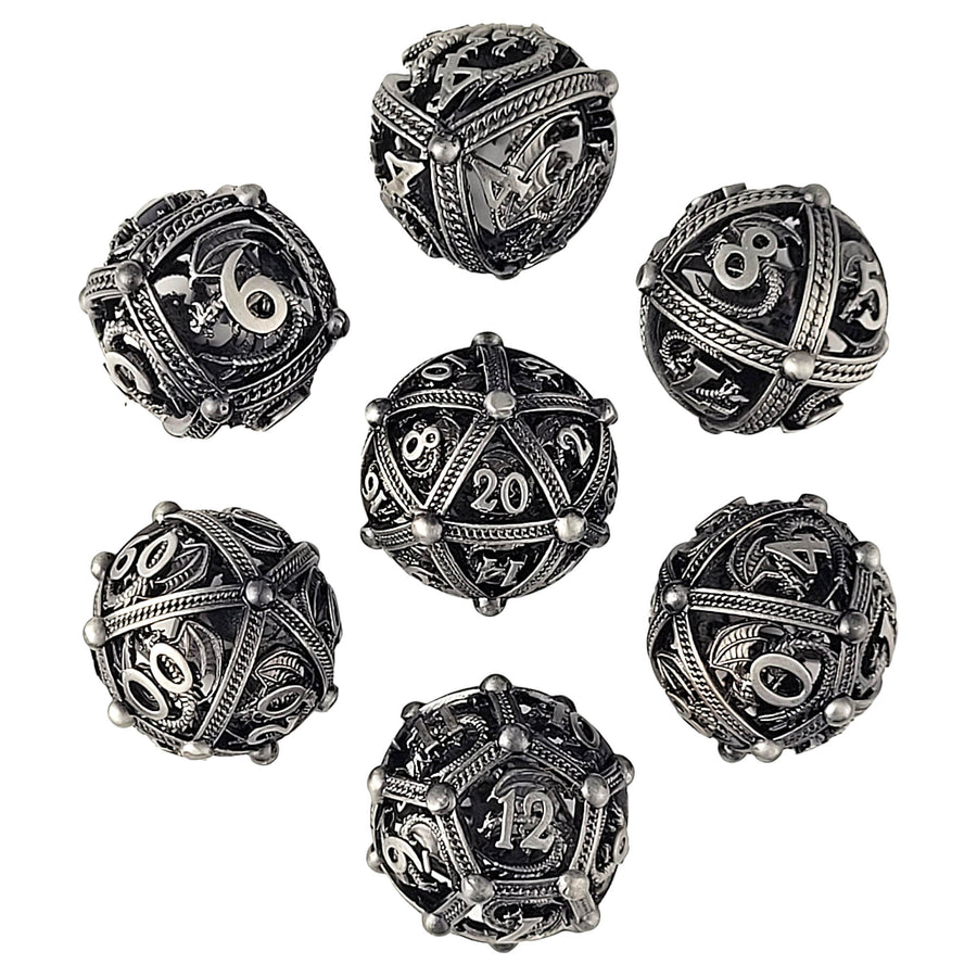 Dragons Bauble Antique Silver Hollow 7-Piece Metal Dice Set