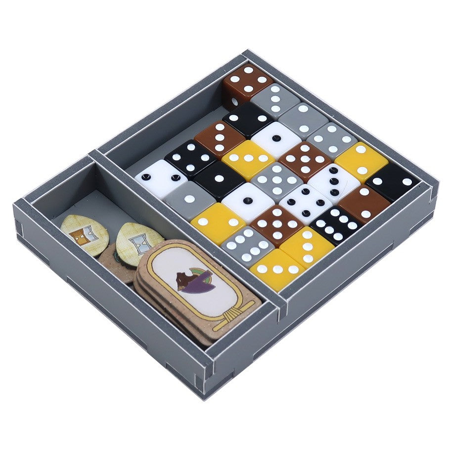 Insert compatible with Tekhenu: Obelisk of the Sun®. The design provides both efficient storage and improved game play. Many of the trays can be utilised during the game, and they greatly aid set-up and clear-away times. The insert is arranged in up to three layers. Note that the obelisk is place proudly in the center of the trays, with the cloth bag rolled up underneath.