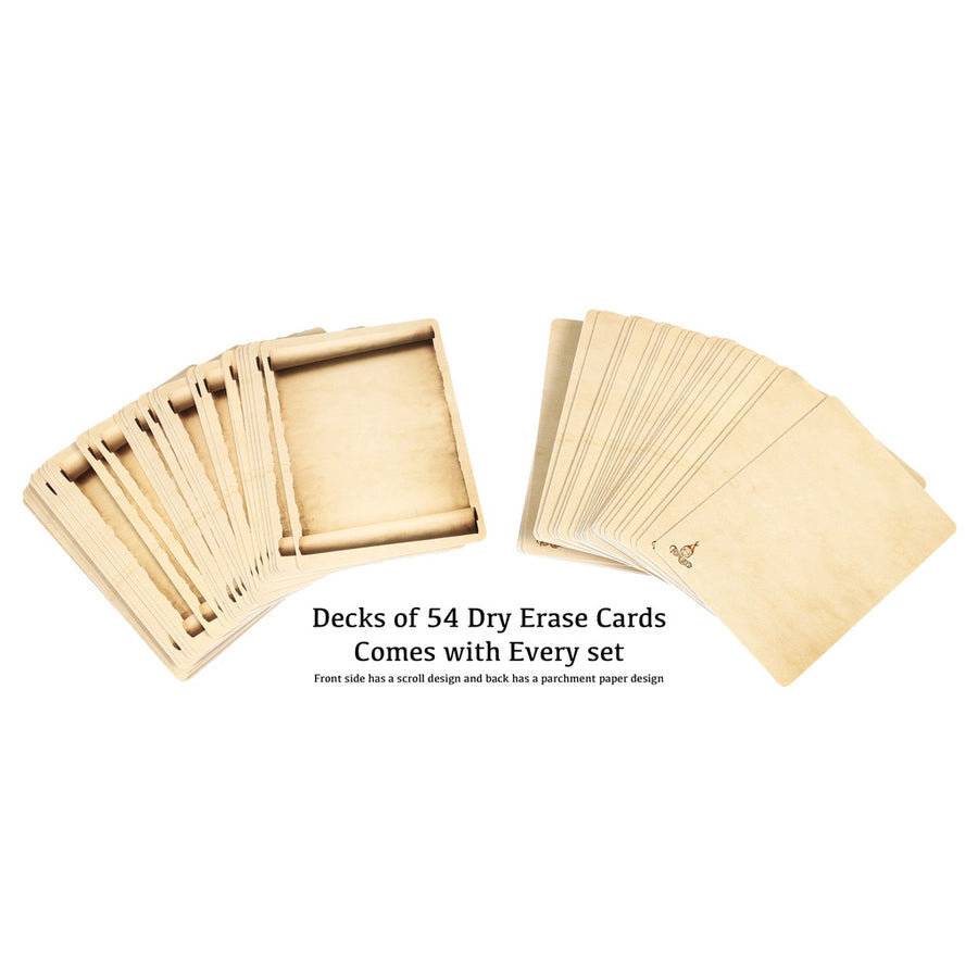 DECK OF CARDS: Included is a deck of 54 customizable double sided dry erase spell cards. One side with a scroll design and the other size with a parchment paper design. Can be used with dry or wet erase markers