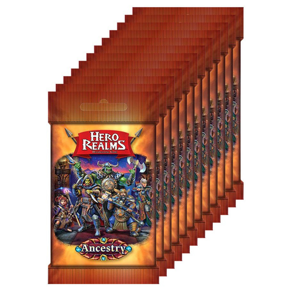 Each pack contains a rules sheet and 20 new Ancestry cards for use with Hero Realms Deckbuilding Game: Dwarf, Hammer Strike, Hammer, Pick, Elf, Elven Wisdom, Elven Grace, Sunstone Brooch, Ogre, Crush You!, Shiny Rock, War Club, Orc, Battle Rage, Bully, Ragged Blade, Smallfolk, Hide, Burgle, and Friendly Banter.