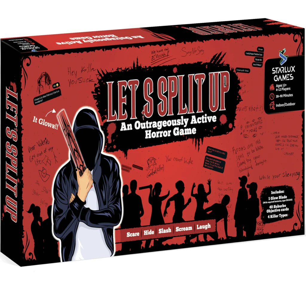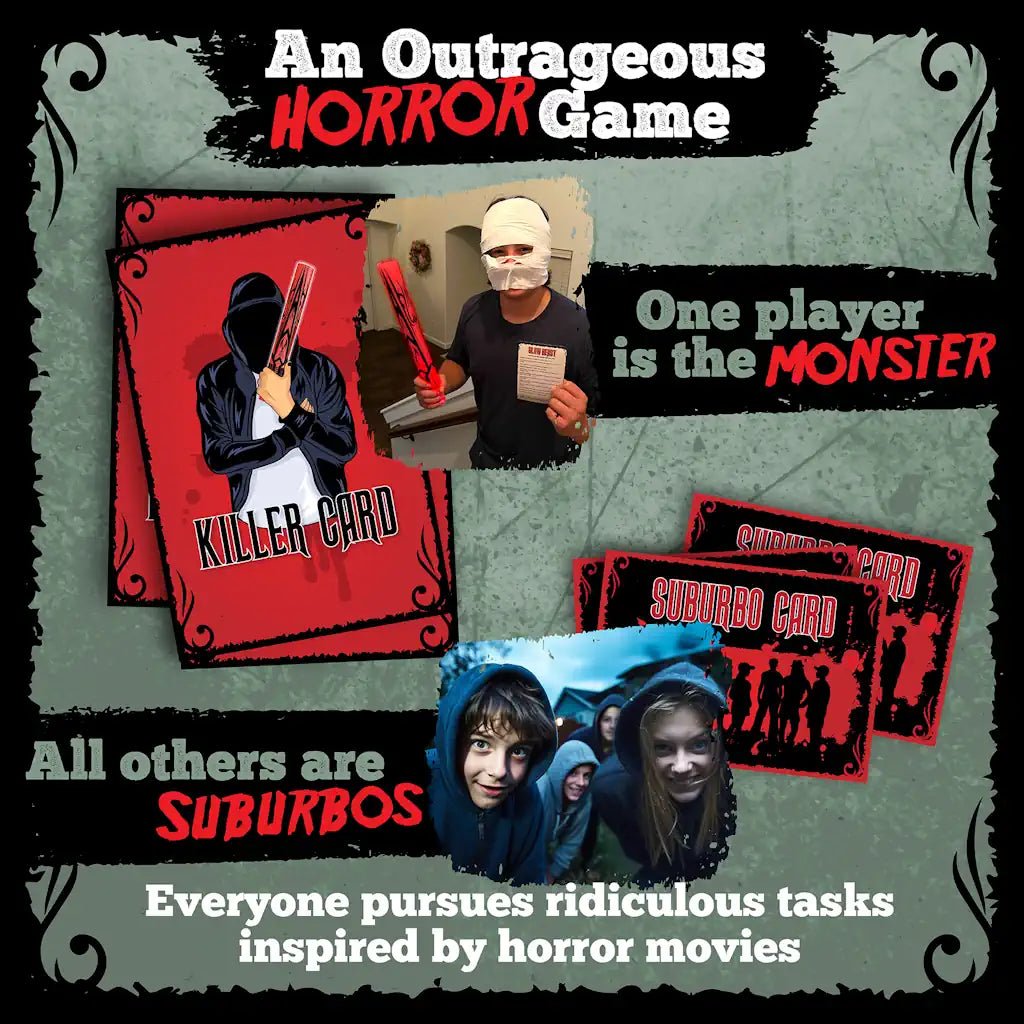 An active horror game! Run, seek, hide, record your living will, beg for mercy, leave creepy notes. It’s Suburbos vs the killer in this real time, riotous horror game. Includes four monster options, forty “Suburbo” objectives and one glow blade.