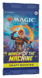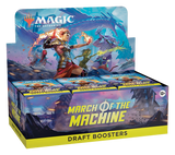 The March of the Machine Draft Booster Box contains 36 March of the Machine Draft Boosters. Each Draft Booster contains 15 cards and 1 token/ad card or Helper card, including 1–2 card(s) of rarity Rare or higher and 3–5 Uncommon, 8–9 Common, and 1 Land cards. Traditional Foil Borderless Mythic Planeswalker in <1% of boosters. Traditional Foil of any rarity replaces a Common in 33% of boosters.