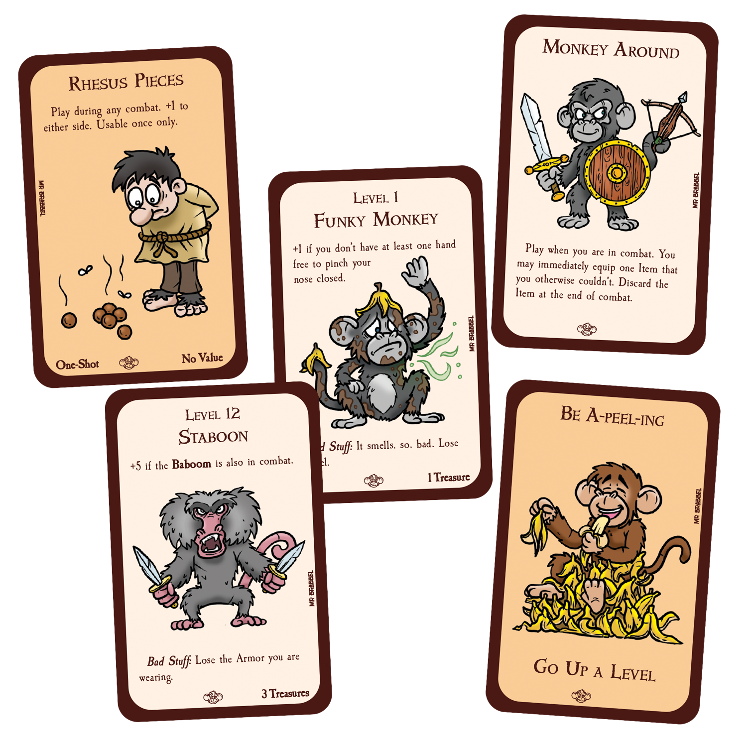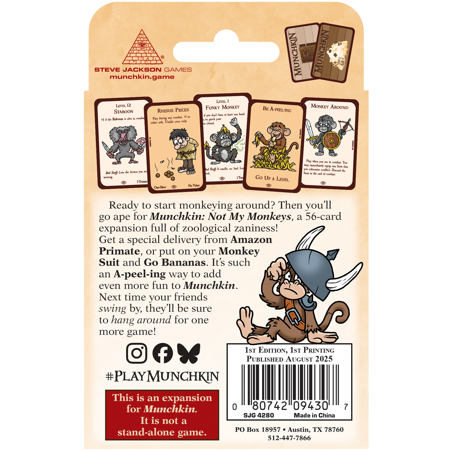 Ready to start monkeying around? Then you'll go ape for Munchkin: Not My Monkeys, a 56-card expansion full of zoological zaniness! Get a special delivery from Amazon Primate, or put on your Monkey Suit and Go Bananas. It's such an A-peel-ing way to add even more fun to Munchkin. Next time your friends swing by, they'll be sure to hang around for one more game!