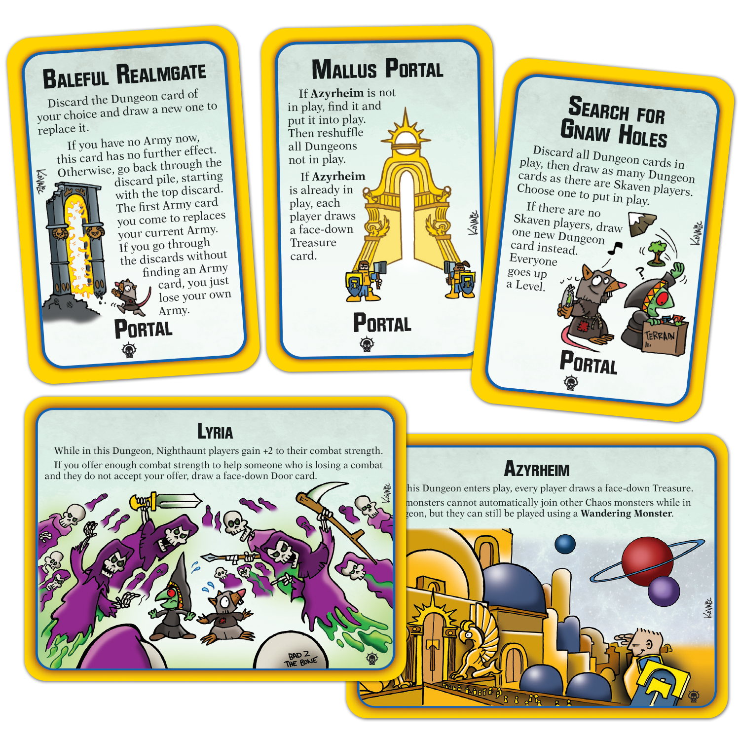 The Age of Sigmar is an epic setting in which heroes, gods, and monsters clash upon the fantastical battlefields of the Mortal Realms. Until now, you’ve had to imagine how those realms impacted your games of Munchkin Warhammer Age of Sigmar. Now you can explore 20 of these wondrous locations with the Dungeon and Portal cards found here. Betray your friends in Anvilgard, explore both sides of Hammerhal, and strike dangerous bargains with the Undead in Ulfenkarn. Take a tour of the Mortal Realms for near-infinite fun!