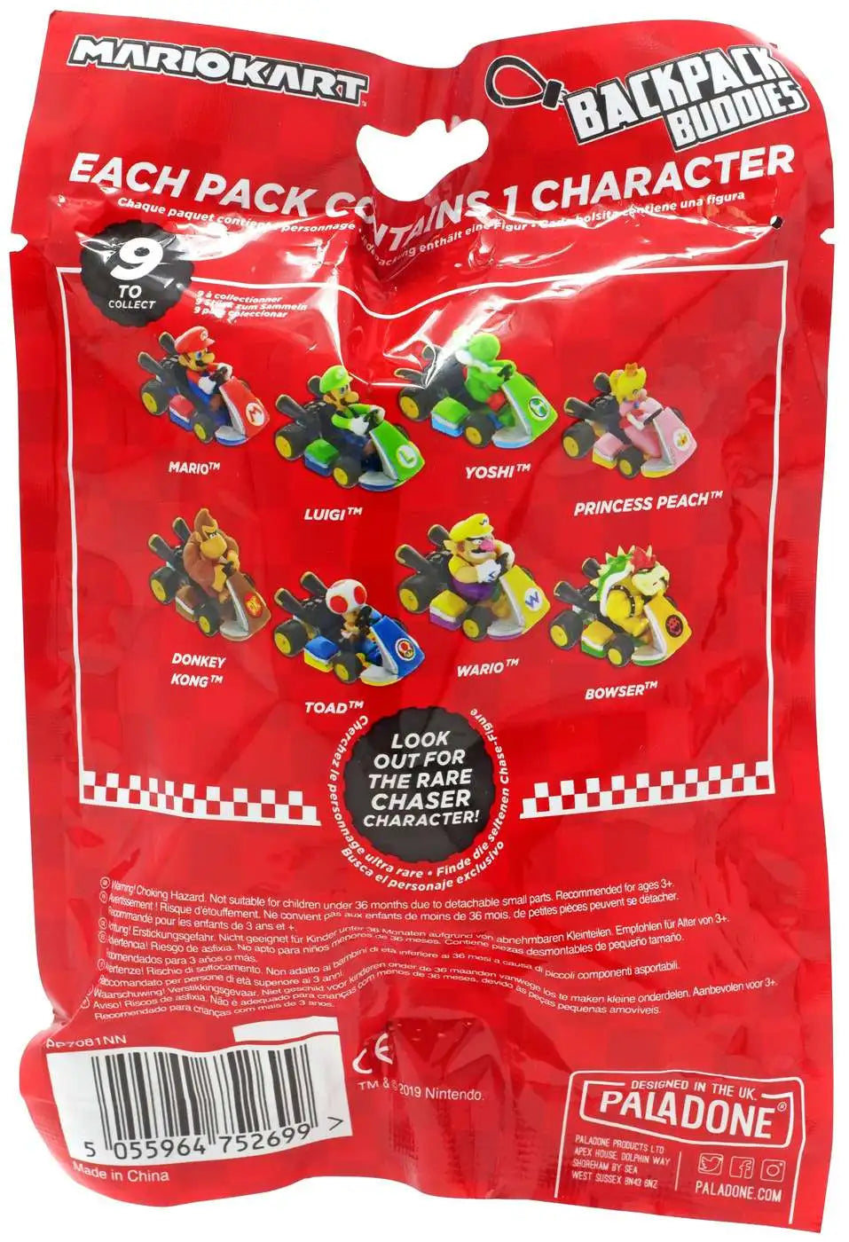 Make your bag or backpack even more exciting with these Mario Kart Backpack Buddies a fun collection of characters on their signature karts from the classic family friendly game Mario Kart. Which collectible character is in the blind bags? Its a surprise! It could be one of the following characters: Mario Luigi Yoshi Peach Toad Wario Donkey Kong Bowser or the super rare chaser character!