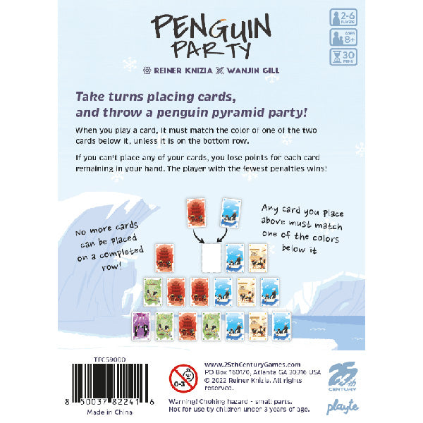 Penguin Party is a card shedding somewhat cooperative game designed by Reiner Knizia in which you are working together to build a penguin pyramid. Penguins love to party together and their favorite way to celebrate is by fishing.