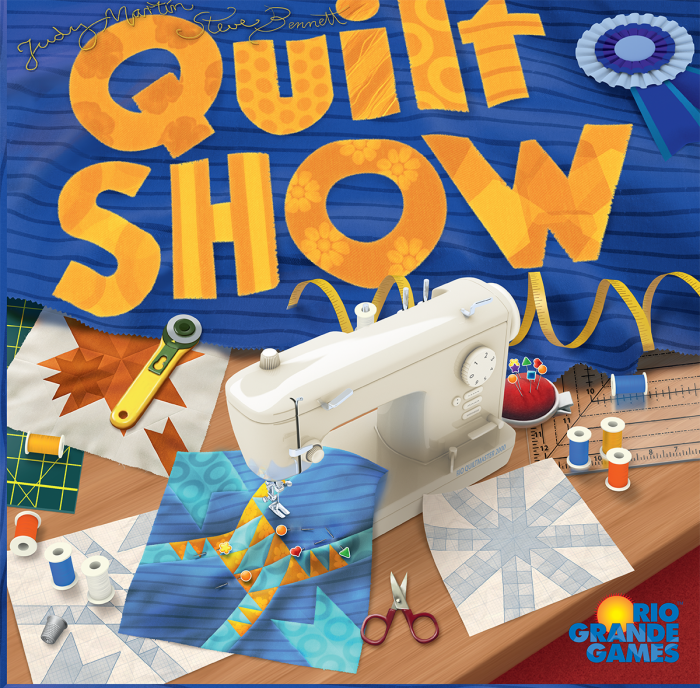 Quilt Show is a game about collecting fabric to construct high-quality quilts. “Quilters” collect fabric cards, which can be exchanged for block tiles. The quilters race the clock as they amass block tiles that they can combine into one or more quilts at a time. They can mix block tiles of a single color or a single pattern to make a quilt. Three times during the game, when the clock reveals it is time for a quilt show, quilts are entered and prize money is awarded. At game’s end, the quilter with the most prize money wins!