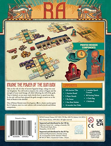 Invoke the power of the sun god! Take on the role of a line of ancient Egyptian kings, ruling over your vast kingdoms. You will work to improve the culture of Egypt and the strength of your royal lineage, all while following the will of the gods. Time is limited, so you must wisely decide how to spend your days. In the end, will you have pleased the gods enough to move on to the Field of Reeds in the afterlife? One of Reiner Knizia’s most loved games, RA is a classic auction game for 2-5 players, now in a new edition with revised artwork and deluxe components.