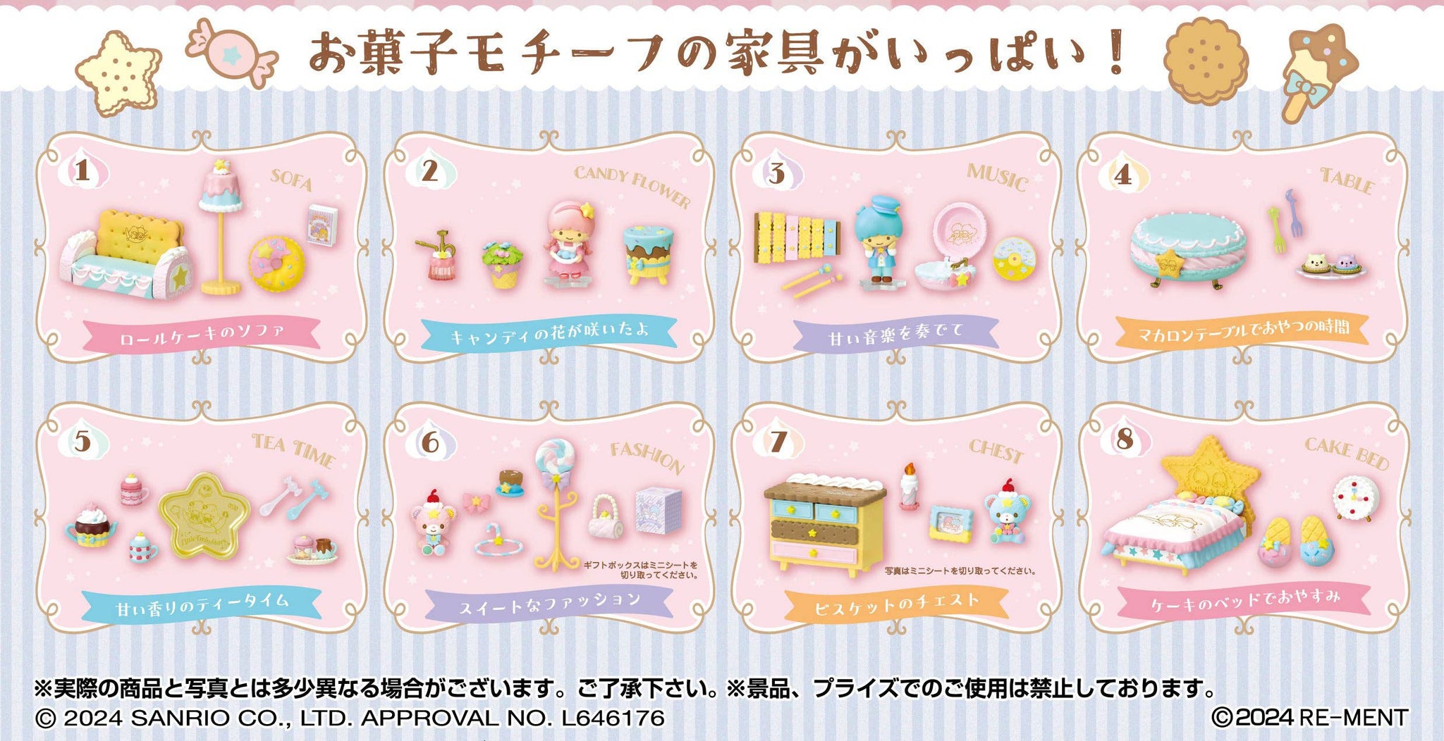 Sanrio's Little Twin Stars have furnished their home with lots of furniture in candy motifs! There are eight different items to collect and trade, and you'll get one of each.