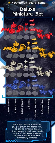 In each of the four player colours (blue, red, white, yellow), the Rocketmen: Deluxe Miniature Set supplies 1 Space Station, 2 Space Hotels, 1 Orbital Shipyard, 2 Satellites, 3 Manned Spaceships, 2 Manned Bases, and 1 Asteroid Mining. Also 9 clear acrylic bases per player, in lieu of the players' tokens, to mark successfully-launched missions.