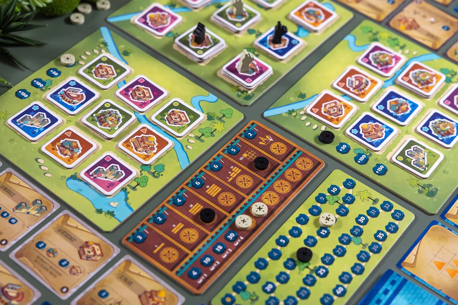 The King of Babylon wants to offer a marvelous present to his wife, Queen Amytis: The most beautiful city ever created. He asks two of the best Architects in the world to design the city, and only the very best one will be built. It's now up to you to create the best design. Architects of Amytis is a Tile placement game, containing some worker placement and even some Tic Tac Toe mechanisms. During your turn, you'll have to select a tile among the available ones on the main board, and place one of your Architect Pawn on the corresponding pile. Then, you'll place the tile on your board wherever you want (on a free spot, or covering another tile to make your city grow higher). Each tile is colored (4 colors) and represents a building (6 different types). Each building type will score directly when you place the tile. And the colors will allow you to reproduce some of the King's projects (a colored pattern inside your city) that will grant you points at the end of the game.