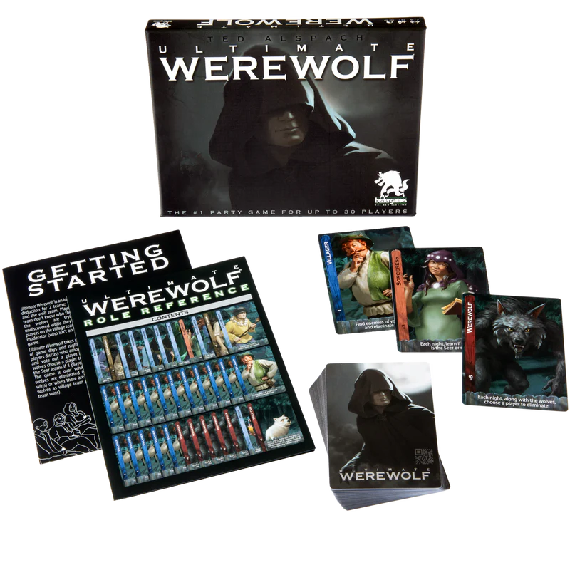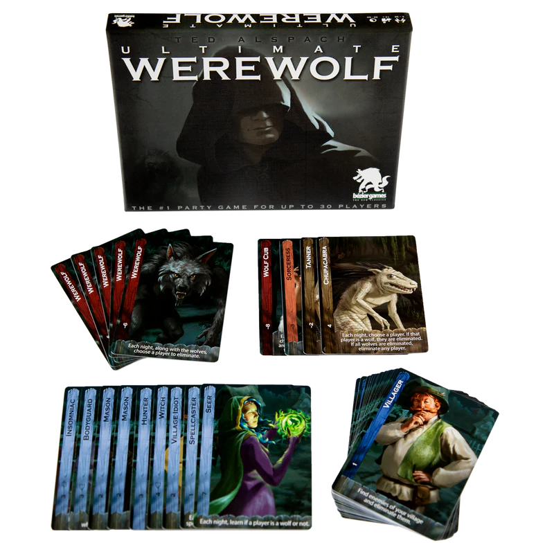 Ultimate Werewolf: Revised Edition features more than 30 unique roles, 18 different scenarios to allow groups of all sizes and experience levels, a set of 80 fully illustrated cards, a moderator scorepad to keep track of games, and a comprehensive game guide with dozens of pages chock-full of insights, tips, and strategies. With all-new art and a great new card design, it`s the perfect way to introduce groups of 7-30 people to Werewolf.