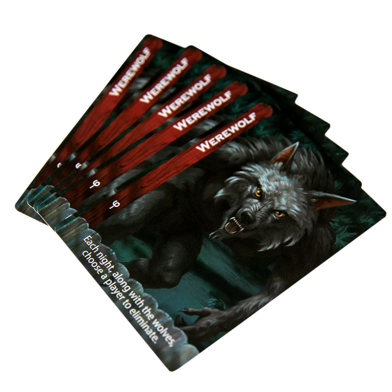 Ultimate Werewolf is an interactive game of deduction for two teams: Villagers and Werewolves. The Villagers don't know who the Werewolves are, and the Werewolves are trying to remain undiscovered while they slowly eliminate the Villagers one at a time. A Moderator (who isn't on a team) runs the game.