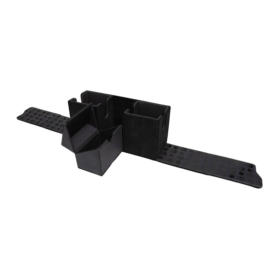 Two compartments to the left and right of the Alcove® Vault can each hold up to 100 sleeved standard sized (2.5" x 3.5") trading card game cards and feature easy-to-access finger notches to easily remove your decks. The center compartment can hold an additional deck or store dice, tokens, counters, and other small gaming accessories. The Alcove® Vault's lids are held secure by powerful magnets and the entire body is wrapped in premium leatherette material.