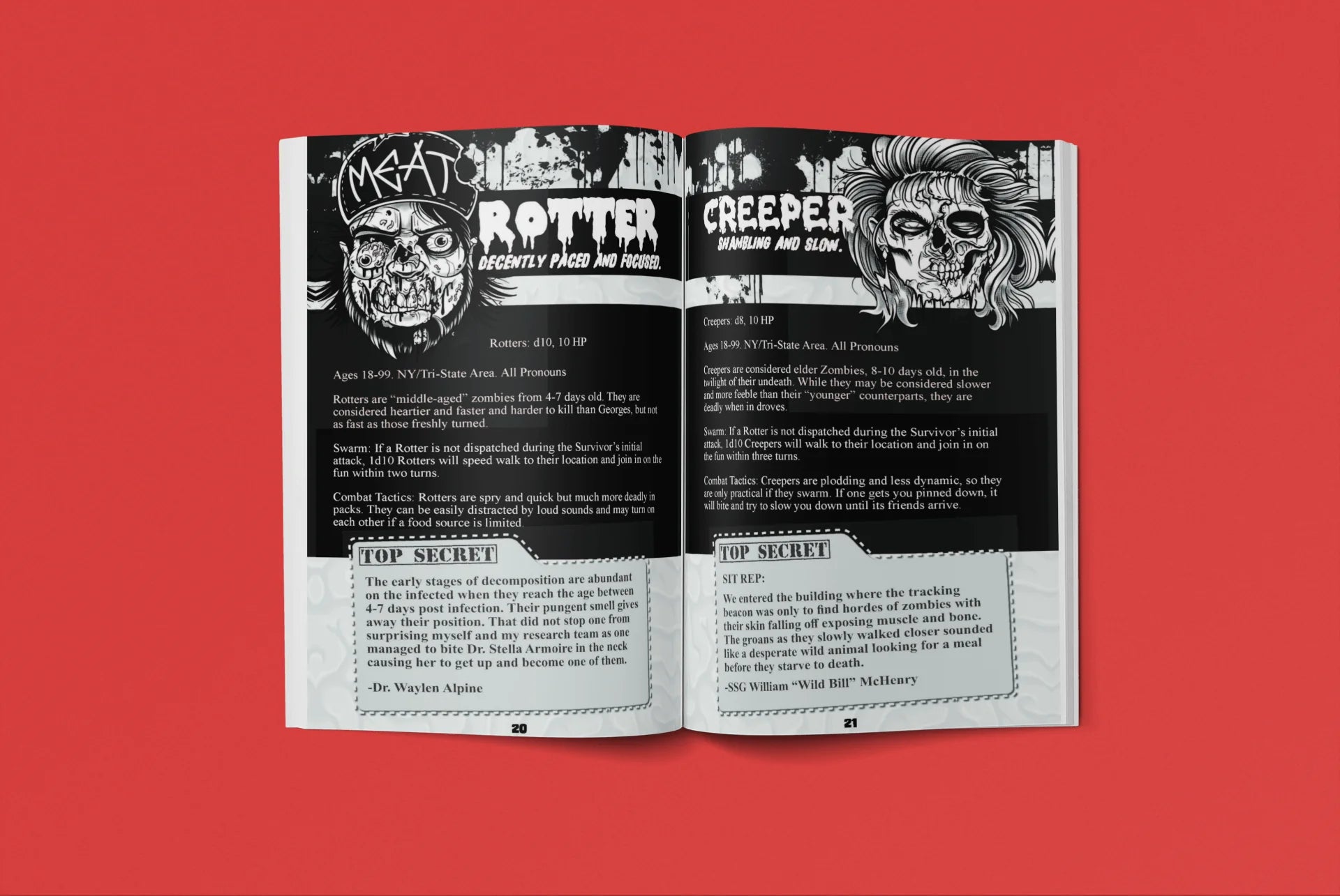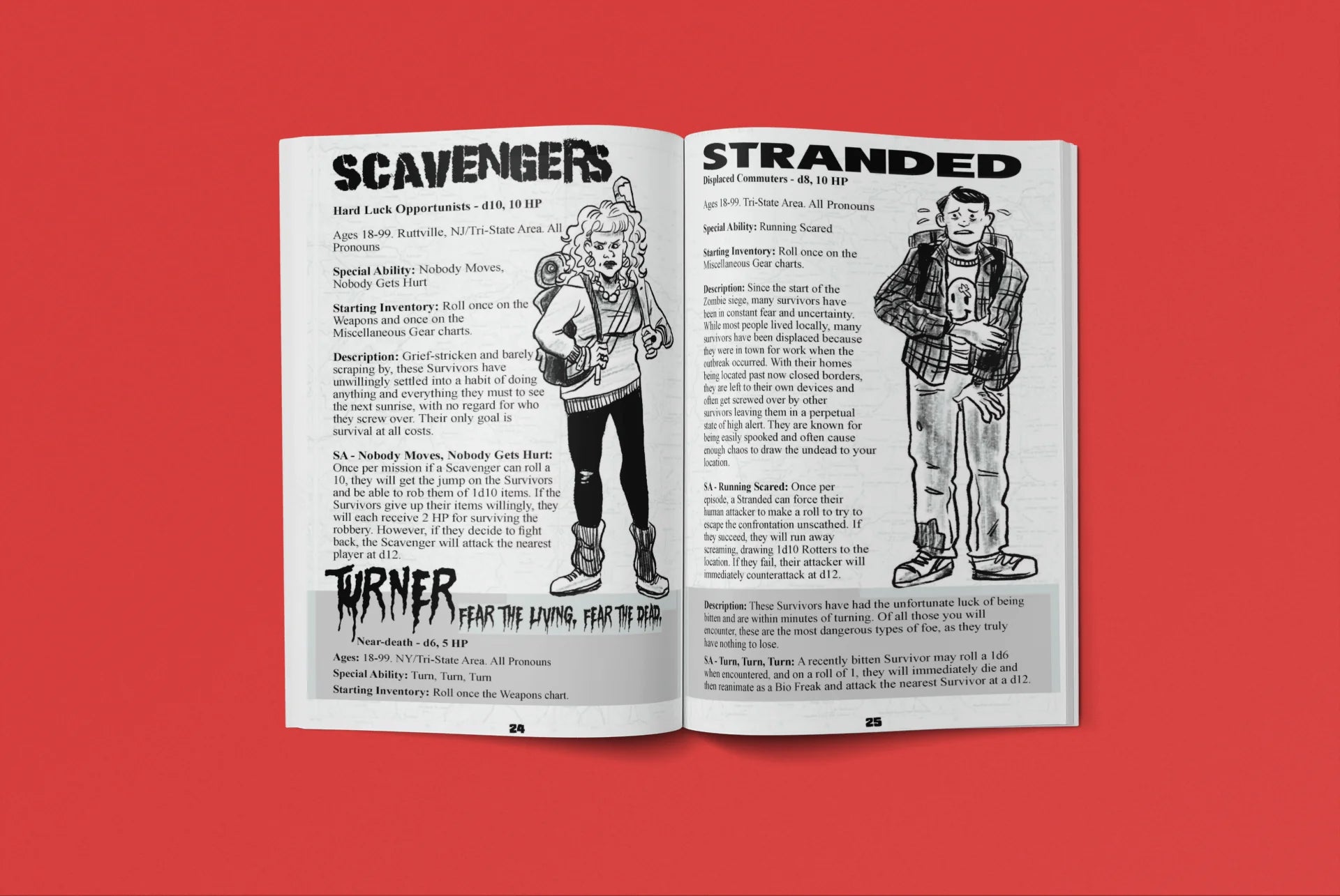 Zombie Braineaters! Suburban Decay In The U.S.A. is a survival horror gauntlet TTRPG for 1 to 6 players, in which the expectation is that the character you start with may not be the character you end with.